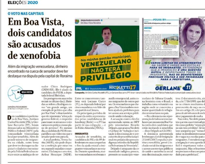 O candidato a prefeito de Boa Vista pelo PSL, partido que elegeu o atual presidente da República, utilizou o acentuado fluxo de venezuelanos pela fronteira brasileira para promover sua campanha ao posto mais alto da capital roraimense. Não tardou muito e logo outra candidata à prefeitura da mesma cidade, do Partido Progressistas, apareceu sob o mesmo holofote.