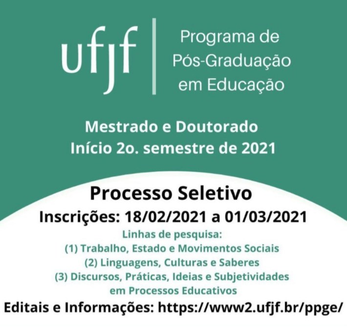 O Programa de Pós-graduação em Educação da Universidade Federal de Juiz de Fora está com inscrições abertas para Mestrado e Doutorado e há vagas para cotistas, que incluem imigrantes e refugiados. O período de inscrição vai de 18/02 a 01/03 e o início das aulas é no 2º semestre. Mais informações aqui.