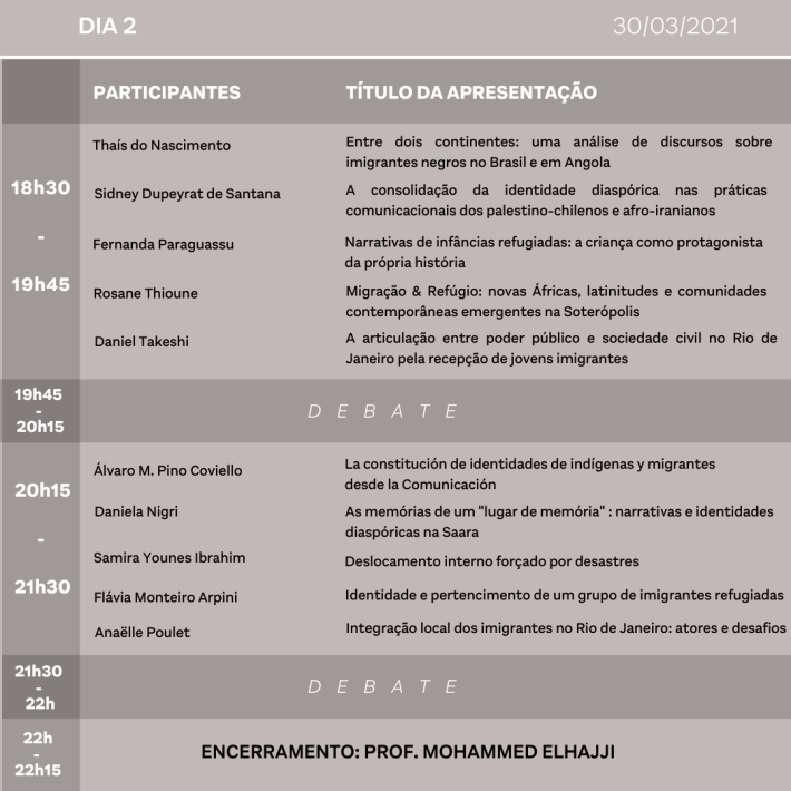 A programação do encontro (veja abaixo) inclui 21 sessões sobre os trabalhos de pesquisa empreendidos pelos integrantes do grupo coordenado pelo Prof. Dr. Mohammed ElHajji, que vão de projetos de mestrado recém-iniciados até tese de doutorado apresentada no último ano. A proposta do encontro é socializar esses estudos e promover debates e reflexões acerca das migrações transnacionais, diásporas e TICs.