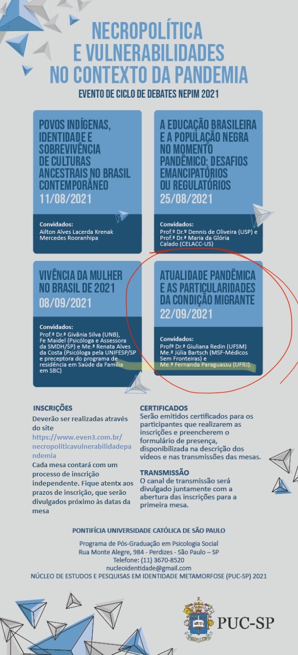 No dia 22, às 16h30, será a vez do painel “Atualidade pandêmica e as particularidades da condição migrante”, parte do evento “Necropolítica e vulnerabilidades no contexto da pandemia” promovido pelo Núcleo de Estudos e Pesquisas em Identidade e Metamorfose (NEPIM), da PUC-SP. A mesa propõe discutir a condição do ser/estar migrante na atualidade pandêmica, tendo em vista os atravessamentos da atual configuração sociopolítica brasileira. A atividade visa a interlocução de profissionais e pesquisadores para uma discussão ampla, partindo de suas experiências analíticas e de pesquisa no Brasil e no exterior.