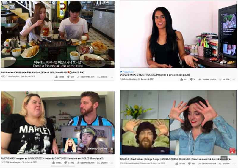 Esse é o cenário da midiatização profunda, que pode ser traduzida como a interdependência cada vez maior entre as mídias e a sociedade, intensificada pela presença das plataformas digitais e o controle de informações mediante a produção intensiva de dados. Portanto, ao conceber que boa parte das relações sociais se dá nas plataformas digitais – não totalmente, nem reduzindo o objeto comunicativo a isso –, observei também que migrantes em posição de influenciadores (ou candidatos ao posto) que residiam no Brasil dialogavam com um variado e numeroso público levantando questões fundamentais sobre seu processo de migração. Por outro lado, esse vasto ecossistema midiático, que abrange diversas nacionalidades, gêneros, faixas etárias e níveis de engajamento na internet, também é responsável por outro tipo de conteúdo alinhado a curiosidades do olhar estrangeiro sobre o Brasil e as reações (reactions) decorrentes dessas trocas culturais.