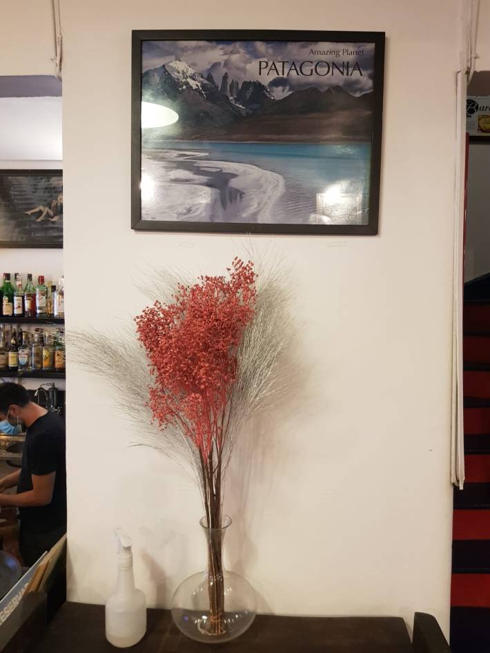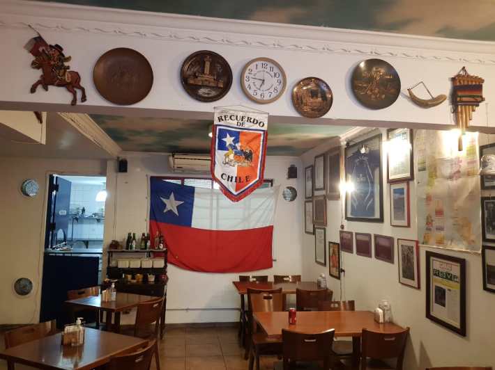 O empreendimento foi também uma forma de manter um vínculo forte com a terra natal. O filho mais novo, enólogo de formação, trabalha no restaurante. E as referências ao Chile são inúmeras. Começando pelo mural na varanda, que, além de apresentar o menu, mostra frases representativas da chilenidad como “si es chileno es gueno” e “más chileno que los porotos“. No salão interno, quadros e pratos com imagens de locais como Torres del Paine e o Atacama, instrumentos de música andinos, referências a Neruda e Gabriela Mistral, flâmulas chilenas, camisetas do Colo-Colo, Universidad de Chile e Universidad Católica, uma página do tradicional jornal Chile en Evidencia, um pôster da Copa do Mundo de 1962 e, como não poderia deixar de ser, uma grande bandeira chilena.