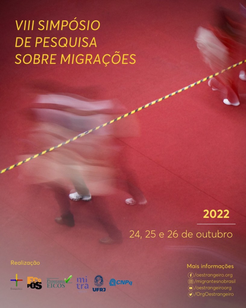 El VIII Simposio de Investigación sobre Migraciones tiene como objetivo reunir investigaciones y experiencias en el tema, especialmente de investigadores de maestría, doctorado y posdoctorado. Hay varias áreas de conocimiento que ayudan a construir este evento de 13 años. En 2022, estaremos en formato híbrido – en el Campus Praia Vermelha de la UFRJ (Auditorio Luiz Fernando Parazzo, CPM – ECO) entre el 24 y el 26 de octubre y a través del canal de YouTube oestrangeiro.org. El evento es gratuito y contará con anales de trabajos aprobados y presentados.