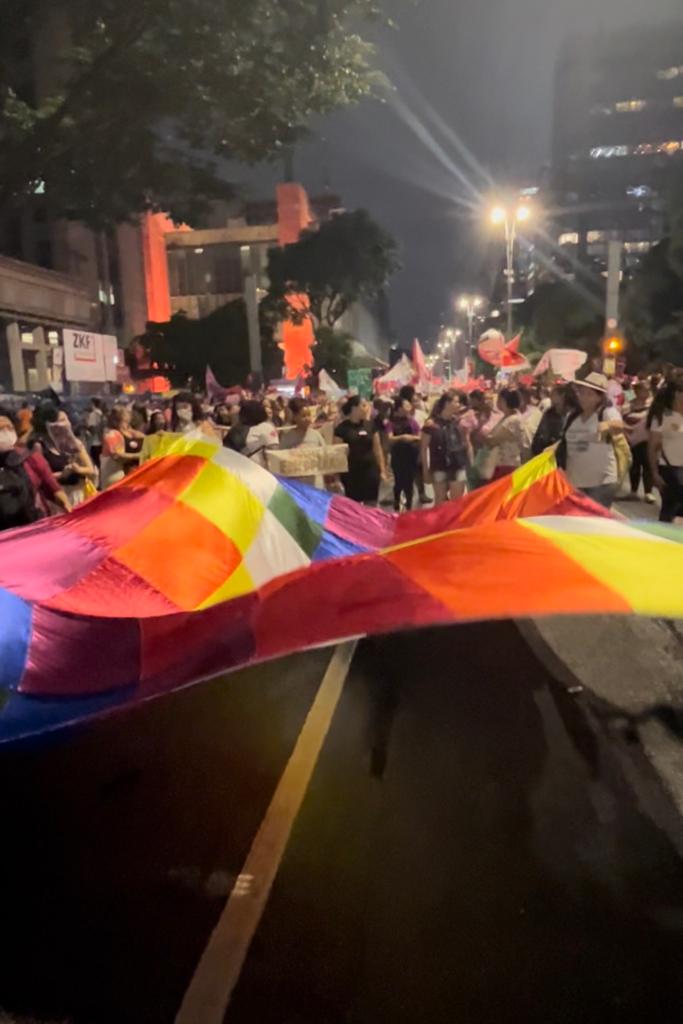 Una valiosa representación de la pluralidad, es la Whipala, símbolo que Fernanda, del colectivo Cholitas da Babilonia, desplegó durante la marcha. Ella comentó sobre la importancia de la cosmovisión andina en relación a las demandas de las mujeres indígenas e inmigrantes: