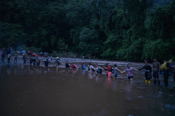 Migrantes formam corrente para atravessar o rio Tacarti, na floresta de Darién, entre Colômbia e Panamá | Frederico Rios Escobar – 7.out.22 /The New York Times
