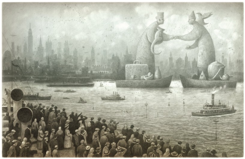 A ideia de demonstrar visualmente o silêncio no processo de imigração não é novidade no mundo dos quadrinhos e nem mesmo no recorte de quadrinhos sobre refúgio e imigração. Shaun Tan aplica esta técnica em sua graphic novel “A chegada” (2006), uma história em quadrinhos muda que conta a saga de um imigrante recém-chegado a uma opressiva e fantástica metrópole. O aspecto surrealista da cidade no quadrinho, repleta de arranha-céus e viadutos de proporções irreais e criaturas bizarras, é uma metáfora para os estranhamentos que muitos imigrantes vivenciam nos países em que chegam (especialmente quando migram para cidades grandes vindos de cidades pequenas ou mesmo áreas rurais).