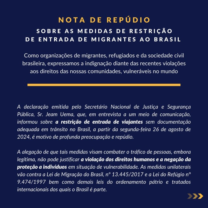 Como organizações de migrantes, refugiados e da sociedade civil brasileira, expressamos nossa profunda indignação diante das recentes violações aos direitos de nossas comunidades, que são particularmente vulneráveis. A declaração do Secretário Nacional de Justiça e Segurança Pública, Sr. Jeam Uema, que anunciou, em entrevista a um meio de comunicação, a restrição de entrada de viajantes sem visto no Brasil a partir de segunda-feira, 26 de agosto de 2024, é motivo de grave preocupação e repúdio. Mais de 60 organizações estão unidas em nossa condenação a essa medida. Os direitos de migrantes e refugiados devem ser garantidos e respeitados. MIGRAR É UM DIREITO.