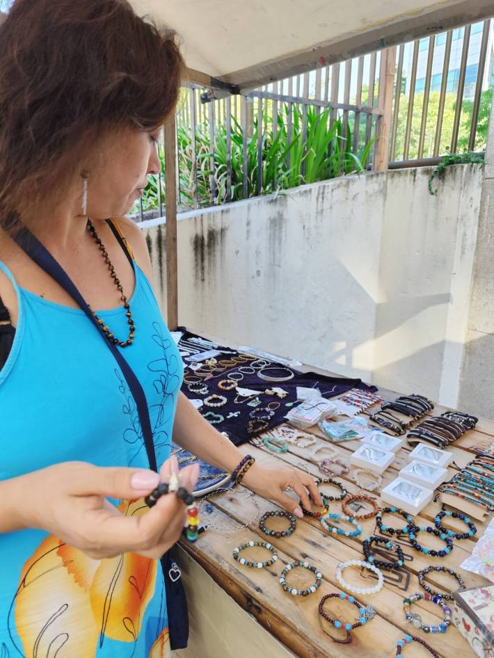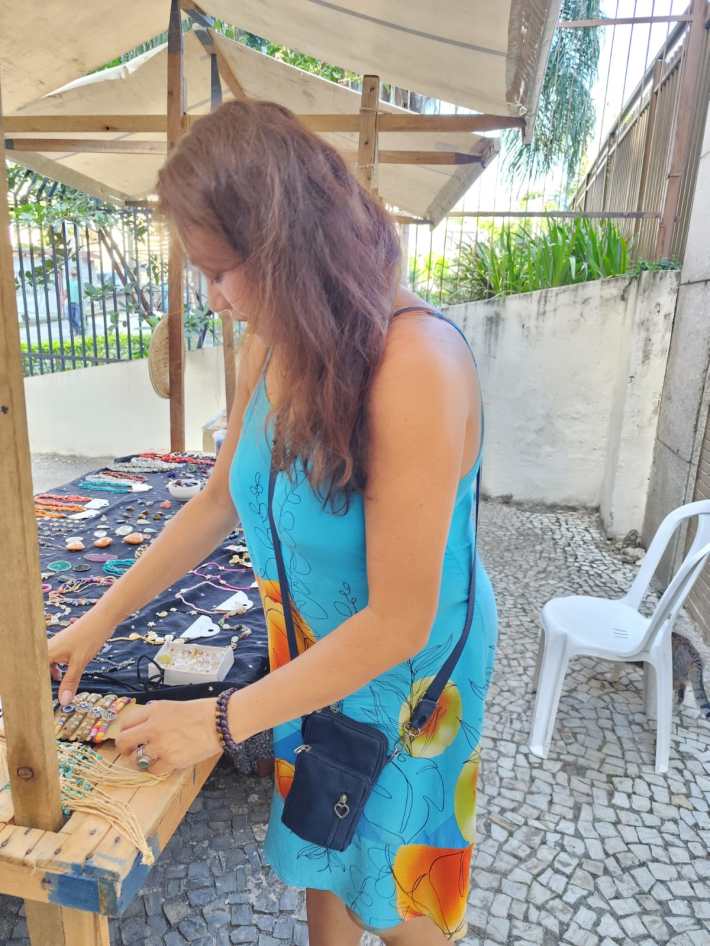 “Já sou uma mulher com mais de 40 anos, com um trabalho pesado. Carrego muita mercadoria. Subo e desço escadas. Moro em um morro, então preciso subir com a mercadoria, às vezes de moto. O estresse de que não se vendeu, de que as pedras se danificaram, que vai chover… tudo isso me gerou um peso emocional.”