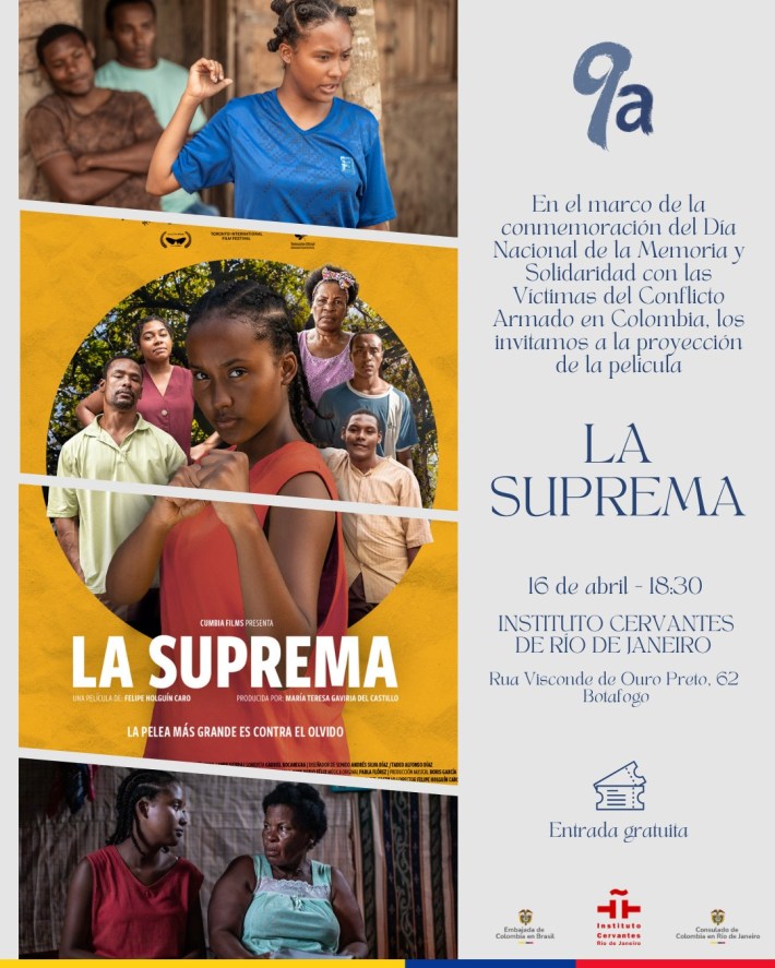 En el marco de las Muestras de Cine Colombiano y como parte de la conmemoración del Día Nacional de la Memoria y Solidaridad con las Víctimas del Conflicto Armado en Colombia, la Embajada de Colombia en Brasil y el Consulado General de Colombia en Río de Janeiro, en alianza con el Instituto Cervantes de Río de Janeiro, invitan a la proyección de la película La Suprema.
